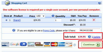 If you have any discount Promo Code, enter it in the Shopping Cart prior to checking out, and click "Update".